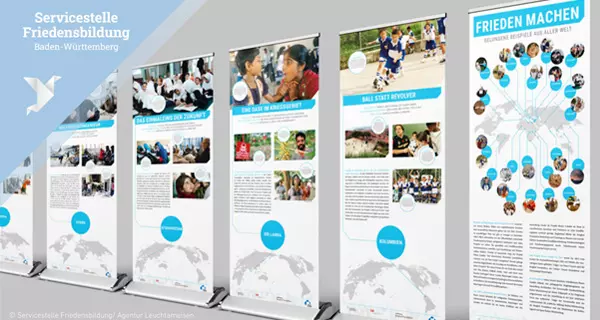Die Servicestelle Friedensbildung Baden-Württemberg hat mit der ausleihbaren Ausstellung ein neues Lernmaterial zur Friedensbildung an schulischen und außerschulischen Lernorten veröffentlicht. Die Roll-up Ausstellung zeigt Menschen aus rund 30 Konfliktregionen der Welt, die gewaltfrei und konfliktsensibel Friedensprozesse anstoßen und sich für Versöhnung und Wiederaufbau einsetzen. Bei Interesse bietet die Servicestelle auch begleitende friedenspädagogische Workshops zur Ausstellung an. Für Schulen in Baden-Württemberg ist der Entleih der Ausstellung kostenfrei.