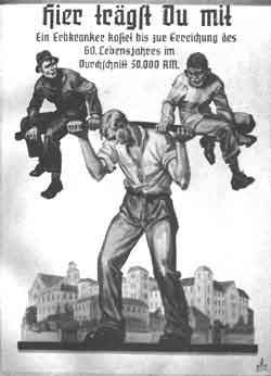 M 8 Ein Geisteskranker kostet täglich RM 4.-, ein Krüppel RM 5.50, ein Verbrecher RM 3.50. In wievielen Fällen hat ein Beamter täglich nur etwa RM 4.-, ein Angestellter kaum RM 3.50, ein ungelernter Arbeiter noch keine RM 2.- auf den Kopf der Familie.