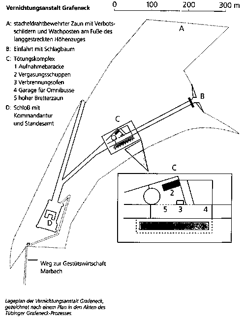 In grau lackierten Bussen mit abgedunkelten Scheiben wurden die Patienten aus den Anstalten abgeholt. Die Aufnahme wurde 1940 heimlich vor der Anstalt Stetten im Remstal gemacht. M 20 Die Omnibusse wurden äußerlich zunächst nicht mit einem Tarnanstrich versehen. Sie wurden vielmehr mit dem roten Außenanstrich und der RP-Nummer benutzt; erst etwa nach der Hälfte der Aktion wurden sie - ebenso wie die Reichspostomnibusse - mit dem grauen Tarnanstrich (Luftschutz) versehen. Es hätte ja gar nicht in unserem Sinne gelegen, diese Omnibusse für ihre Wahrnehmung in der Öffentlichkeit besonders kenntlich zu machen und herauszustellen. Aussage von Hegener am 23.6.1961 im Verfahren der Generalstaatsanwaltschaft Frankfurt gegen Professor Werner Heyde (Ks 2/63), zit. nach: Ernst Klee, Euthanasie im NS-Staat, Frankfurt 1983, S. 124, Anm.50 M 21 Skizze Grafeneck